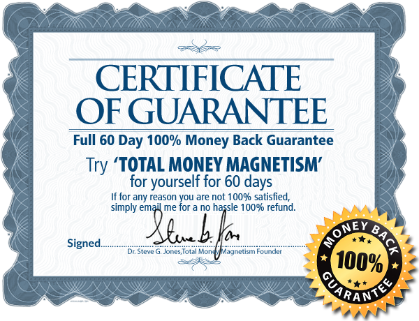 I want you to feel completely confident about purchasing Total Money Magnetism today, so I have added my 60 day 100% money back guarantee to ease your mind.
