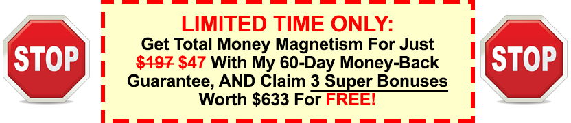 P.S. This course is an electronic download so you can get started right away! No Shipping, No Waiting! And remember, this heavily discounted price of $197 $47 is not going to be around for long, so if you want to get Total Money Magnetism with the three added bonuses worth over $630, you need to act NOW! Don’t wait another second to start living the rich, abundant life you deserve…